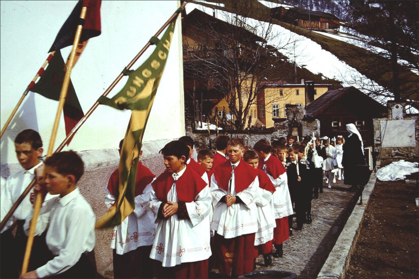 Feierlicher Einzug in die Kirche am Weißen Sonntag, 25. April 1965. Schwester Ruperta beaufsichtigt die Erskommunikanten. Pfarrer Hairer…