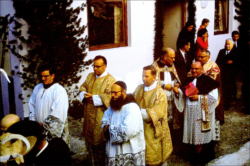 Am 10. Oktober 1965 wird der neue Widum feierlich eingeweiht. Die Tür ist mit Taxen umkränzt,…