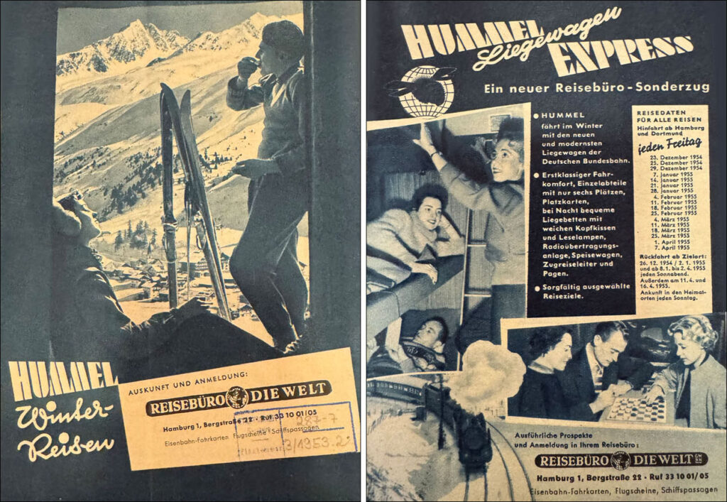 Für das Reisebüro Hummel war das hintere Ötztal in den 1950er und 1960er Jahren eine der Hauptdestinationen im Winter: „Abfahrt jeden Freitag“ im „Liegewagen Express“, mit über zwanzig Zusteigemöglichkeiten zwischen Hamburg und Stuttgart. Der Prospekt von 1954 aus dem Staatsarchiv Hamburg bewirbt den Hummel-Sonderzug mit „bequemen Liegebetten mit weichen Kopfkissen und Leselampen“. Außerdem gibt es „Zugreiseleiter und Pagen“.