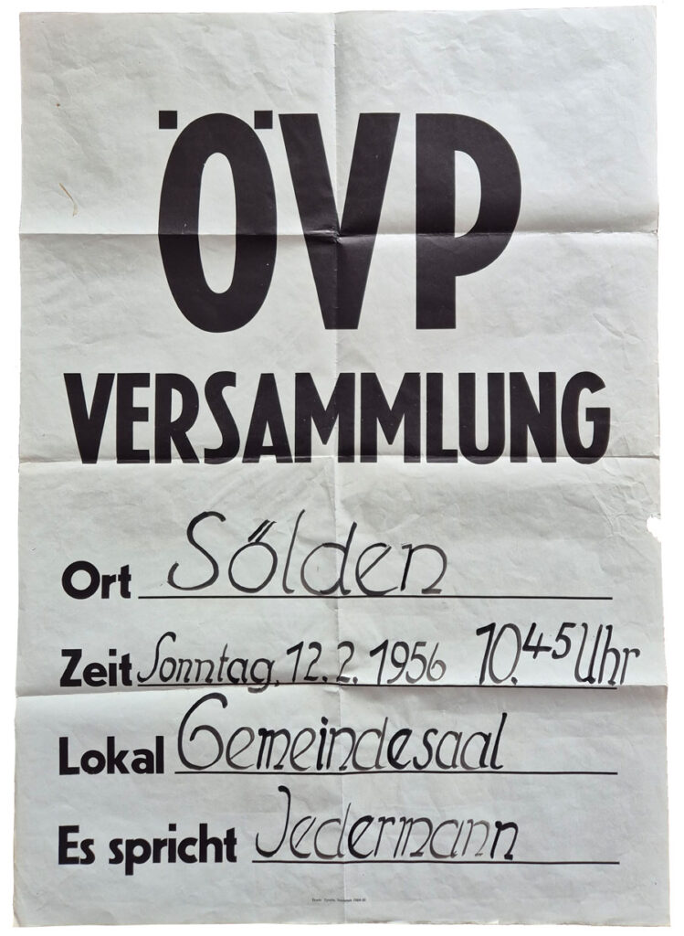 Eine ÖVP-Versammlung in Sölden vor 70 Jahren am Sonntag nach Leschtarkirchen, zufällig oder nicht: Faschingssonntag. Das große Plakat ist vielleicht an irgendeinem Stadel oder einer Schupfe gehangen. Mit „Gemeindesaal“ ist der Kino- bzw. Theatersaal im alten Gemeindeamt gemeint.