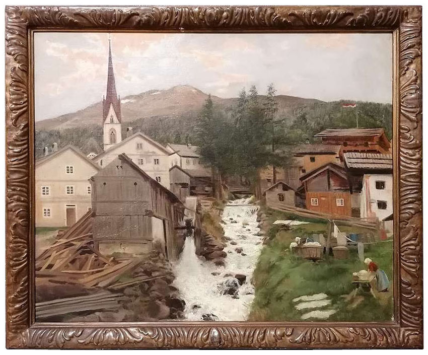 Auf diesem Bild aus dem Jahre 1900, signiert mit V. Becher, scheint es, spielen die Kirche und die Häuser links und rechts des Baches nur eine Nebenrolle. Dem Maler geht es vor allem um den Wildbach, von dem ein Teil über die Säge von Sigmund Falkner (Garbars) umgeleitet wird. Daneben und oberhalb: der Widum, das alte Gemeindehaus (damals auch noch Schulgebäude) und das später „Postburgelas Haus“ genannte Gebäude. Rechts eine Wäscherin vom „Gasthof zur Traube“ (später „zur Post“), darober das Garbars und das Leahnar Haus und der Gasthof Alpenverein.