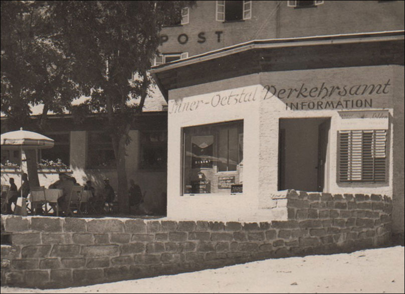 Anfang der 1950er Jahre wurde an das Hotel Post das Büro des Verkehrsvereins Innerötztal angebaut, es nannte sich Verkehrsamt, obwohl es natürlich kein Amt war. Neben der Eingangstüre war die sogenannte Führertafel der „Führerstelle Sölden“ angebracht. Die linke Hälfte war den Bergführern vorbehalten, die rechte war für die Träger. Da wiederum galt jeweils die erste Spalte den „verfügbaren“ Bergführern oder Trägern, die zweite jeweils den aktuell „nicht verfügbaren“. Für jeden gab es ein schönes gemaltes Namenschildchen aus Holz, das je nachdem in die erste oder zweite Spalte geschoben wurde. Auf dieser Lohmann-Aufnahme ist offensichtlich gerade nur ein Bergführer und ein Träger verfügbar, alle anderen mit Gästen unterwegs. Wer von der Tour als Erster zurückkommt und sich im Büro meldet, wird in der Spalte als Erster gereiht und bekommt den ersten Auftrag.