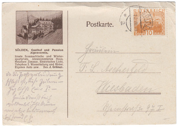 Abseits der Post nutzten auch andere das Werbemittel Postkarte – natürlich ohne Briefmarke. So in den Zwanziger Jahren der Gasthof Alpenverein oder später auch die Pfarre Sölden.