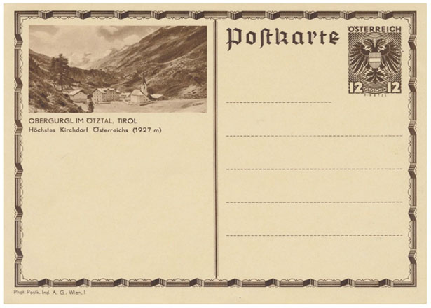 Aber schon früher, bereits um 1930, hat die Post Karten mit Ortsansichten aufgelegt, wie die mit Obergurgl. Vorfrankiert war sie, 1925 war die Krone durch den Schilling abgelöst worden, mit 12 Groschen.