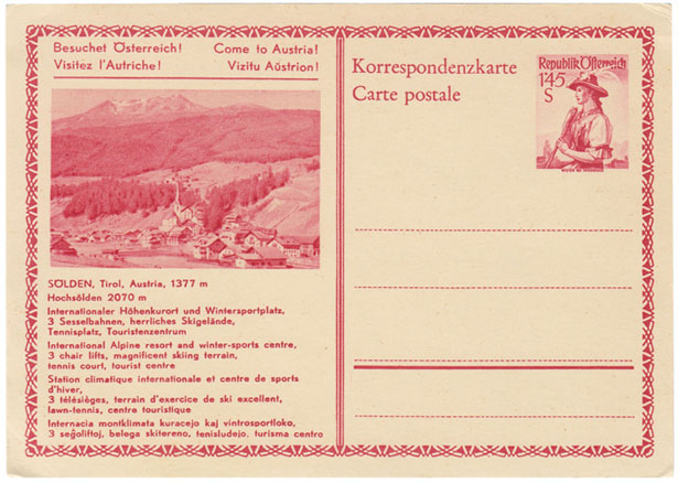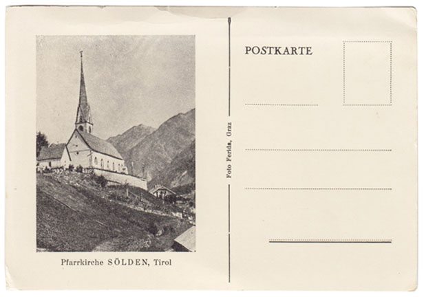 Ob per Briefmarke mit dem Motiv des Venter Kirchleins gleich nach dem Krieg oder Ende der 1950er Jahre mit einer „Korrespondenzkarte / Carte postale“ von Sölden, lustigerweise mit einer Frau in Wiltener Tracht auf der aufgedruckten Briefmarke.