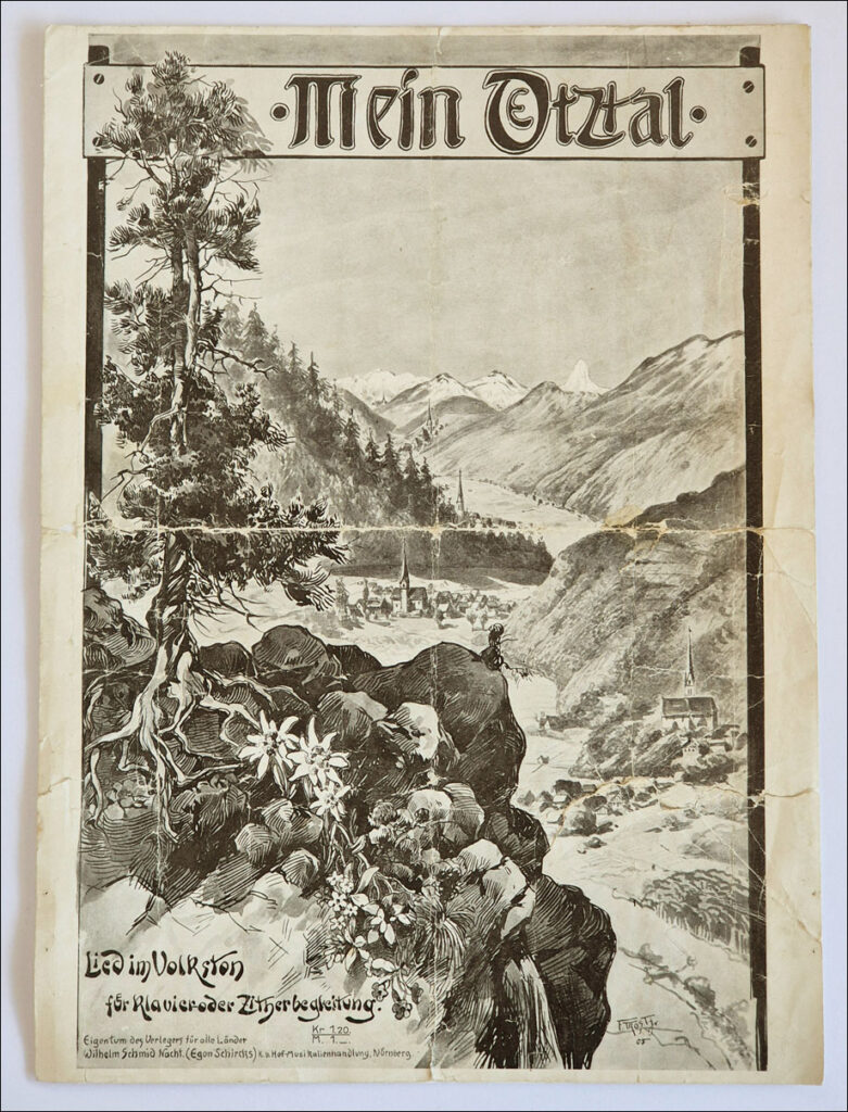 Das Cover des Notenblattes oben, das sogenannte Schmuckblatt, das das Ötztal von Oetz bis Obergurgl zeigt, stammt vom deutschen Maler F. Tros und ist offenbar eigens für die Komposition „Mein Ötztal“ angefertigt worden.