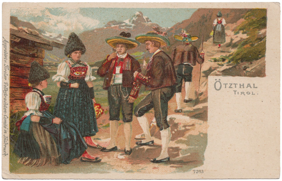 Der schönste Berg weitum darf auf dem Aquarell des Osttiroler Künstlers Franz Burger (1857-1940) den Hintergrund geben für eine in die Landschaft gestellte Ötztaler Trachtengruppe. Das „Tiroler Volkstrachten-Comité in Innsbruck“ hat die Darstellung der Trachten für korrekt befunden und diese selber 1899 als Postkarte herausgebracht.
