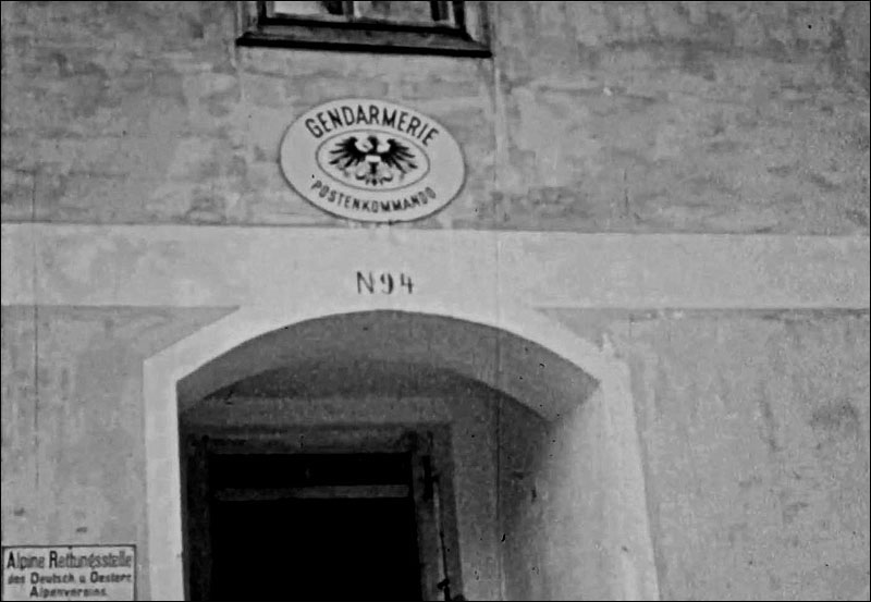 Die Hausnummer 94 deutet darauf hin, dass es am Rettenbach gewesen sein muss. Und richtig, er war im sogenannten Gemeindehaus, das 1865 erbaut worden war, untergebracht, gleich oberhalb des Widums, am Platz, wo später das Lehrerhaus stand und sich jetzt der untere Friedhof befindet. Wie die Tafel links unten zeigt, hatte die Gendarmerie wohl auch die Alpine Rettungsstelle des DÖAV zu betreuen.