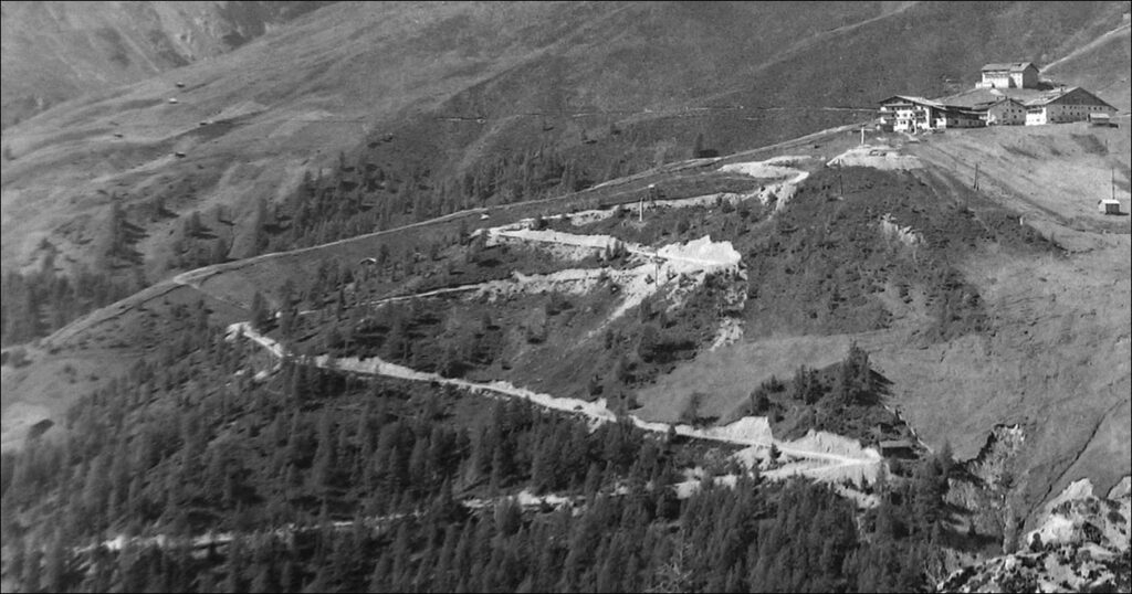 Der Sessellift bestand schon sieben Jahre bevor 1955 endlich eine Straße auf Hochsölden gegraben und gebaggert wurde. Die Aufnahme kurze Zeit später zeigt noch sehr schön oder auch weniger schön, wie sie in den Berg gefräst worden ist. Das notwendige Böschen überließ man der Natur, was diese dann auch besorgt hat.
