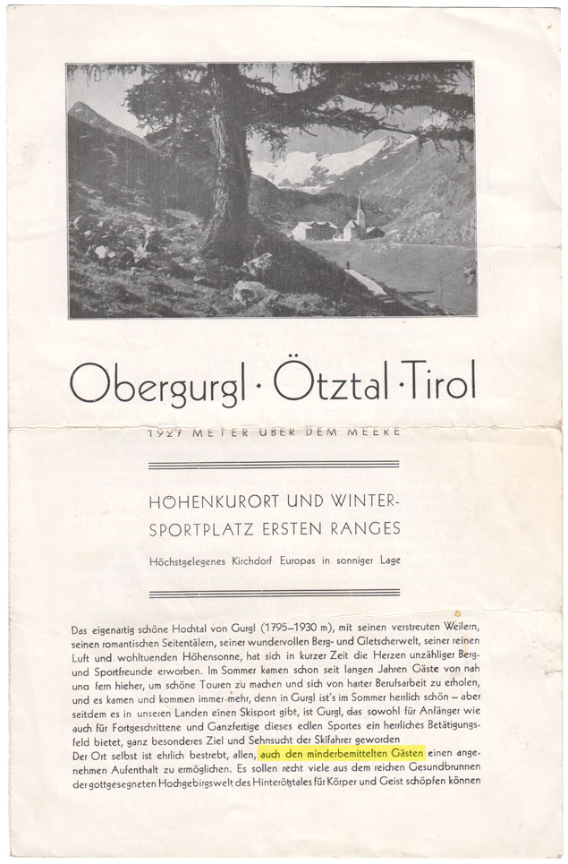 Heute würde sich niemand mehr trauen, das in einen Werbeprospekt hineinzuschreiben, aber früher dachte man bei „minderbemittelt“ nicht zuerst an geistig beschränkt, sondern an weniger wohlhabend. Und Gurgl versuchte 1930, eben auch dieser Gästeschicht ein Angebot zu machen. Im Ortsplan verzeichnet sind auch günstigere Quartiere bei Privaten sowie die Standorte vom Schuster, vom Schreiner und von der Wäscherei.