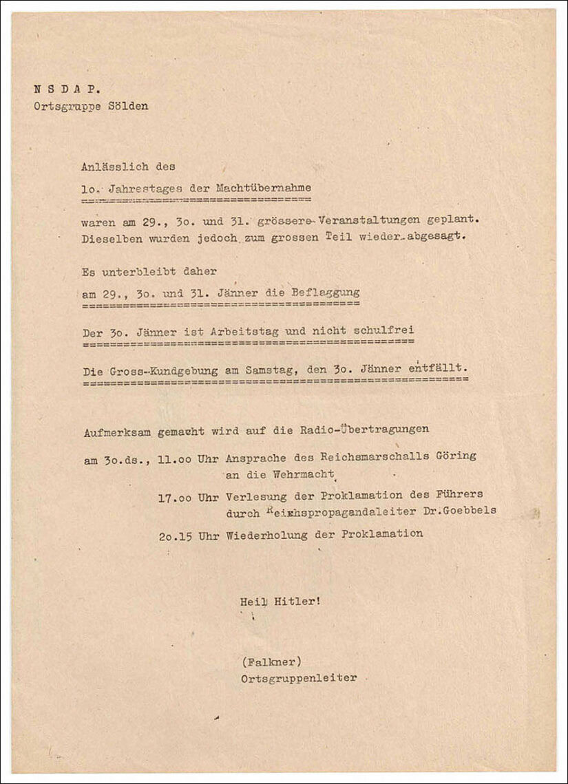 Mit „Machtübernahme“ wird beschönigend die Machtergreifung Hitlers am 30. Januar 1933 bezeichnet. Auch die NSDAP Sölden hatte…
