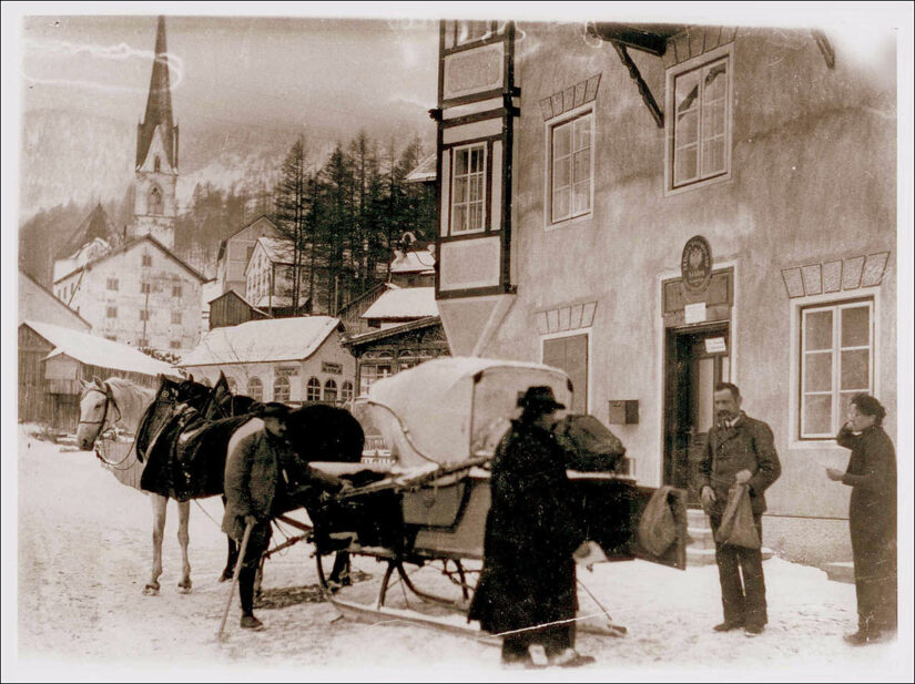 Szene um 1909 vor dem neu erbauten Posthäusl. Auf dem Schild über dem Eingang steht: „K.K.…